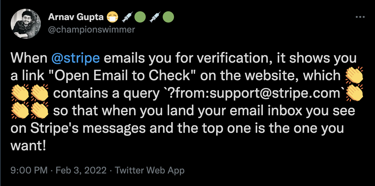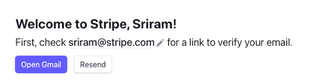When you sign up for a Stripe account, the app takes you to a dashboard page as soon as your account is created and shows a message asking you to verify your email address by clicking on the link sent to you email. Pretty standard right? Well, Stipe steps this UX up a notch by having a button on this landing page to open your email. And they take this to the next level by opening your email with a search query embedded to filter out only the emails sent by Stripe. This is an amazing UX.